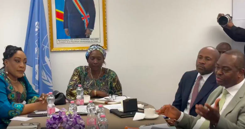 La ministre des Droits humains Chantal Chambu, le ministre de la Communication et Médias Patrick Muyaya, la vice-ministre en charge des Congolais de l’étranger Gracia Yamba Kazadi et l’ambassadeur Paul Empole échangent ce jeudi à la Mission permanente de la République Démocratique du Congo auprès des Nations Unies à Genève avec des fonctionnaires internationaux et ressortissants congolais de Suisse.