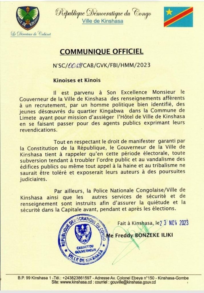 Pour faire face à ce qu’il qualifie de «troubles à l’ordre public» surtout en cette période électorale, il instruit la Police nationale congolaise/ville de Kinshasa ainsi que les services de sécurité et de renseignement afin d’assurer la quiétude et la sécurité dans la capitale avant, pendant et après les élections. «Tout en respectant le droit de manifester garanti par la Constitution de la République, le gouverneur de la ville de Kinshasa tient à rappeler qu’en cette période électorale, toute subvention tendant à troubler l’ordre public et au vandalisme des édifices publics ou même tout appel à la haine et au tribalisme ne saurait être toléré et exposerait leurs auteurs à des poursuites judiciaires», souligne le Directeur de cabinet, Freddy Bonzeke Iliki, dans son communiqué.