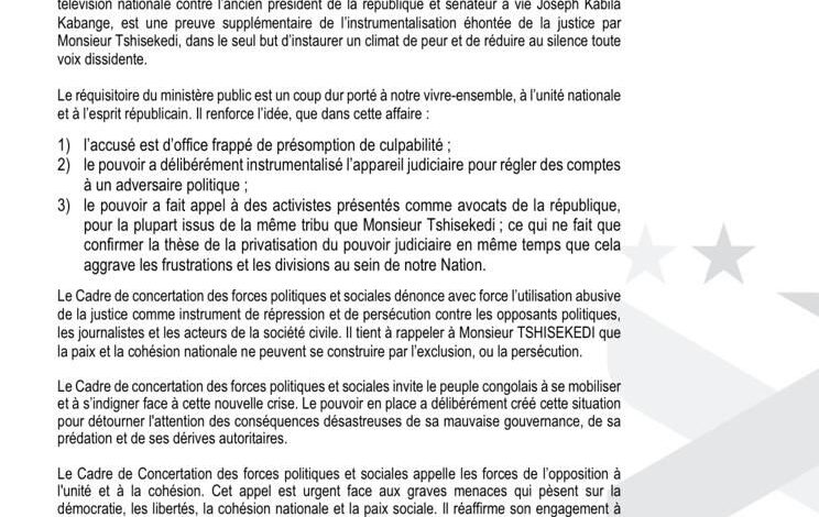 Le cadre de concertation dirigé par Michel Mwika Banza déplore également «l’usage abusif de la justice comme moyen de répression et de persécution à l’encontre des opposants politiques, des journalistes et des acteurs de la société civile». Il appelle donc le peuple congolais à se rassembler et à s’indigner face à cette nouvelle crise. Selon cette organisation, le régime actuel aurait intentionnellement créé cette situation pour détourner l’attention des effets néfastes de sa mauvaise gouvernance, de ses pratiques de prédation et de ses dérives autoritaires. Voici le communiqué du cadre de concertation des forces politiques et sociales.
