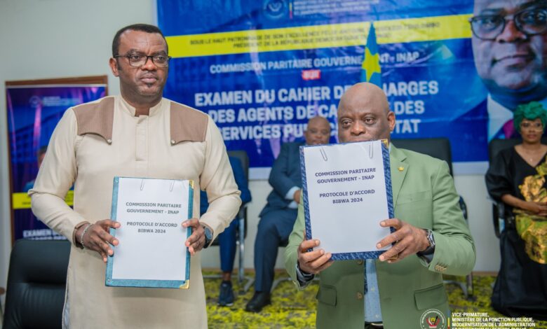 Les travaux de la commission paritaire gouvernement-Intersyndicale nationale de l’administration publique -INAP-, organisés dans le cadre du dialogue social voulu par le Président de la République Félix-Antoine Tshisekedi, se sont clôturés, samedi 16 novembre 2024, en douceur. Ces assises tenues du 11 au 16 novembre pour examiner le cahier de charges des agents de carrière des services publics de l’Etat, ont débouché sur la signature d’run protocole d’accord par les deux parties. Le vice-Premier ministre en charge de la Fonction publique, Jean-Pierre Lihau, le ministre d’État en charge du Budget, Aimé Boji, et le ministre des Finances représenté par sa vice-ministre, O’Neige N’Sele, ont signé l’arrêté interministériel mettant en place une commission permanente de suivi des accords signés par le gouvernement et l’INAP.