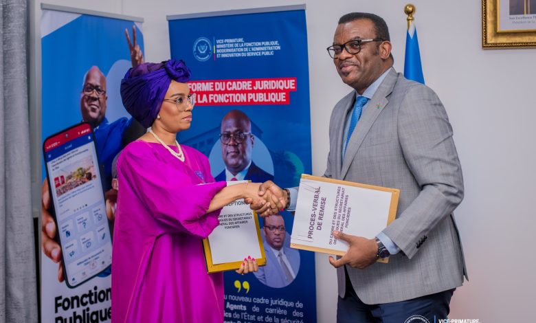 Dans le cadre de la réforme de l’administration publique voulue par le Président de la République, sous la coordination de la Première ministre, le vice-Premier ministre en charge de la Fonction publique, Jean-Pierre Lihau, a remis, mercredi 7 janvier 2026, à la ministre des Affaires foncières, O’Neige N’Sele, un nouveau cadre organique et des structures organiques du Secrétariat général de son ministère.