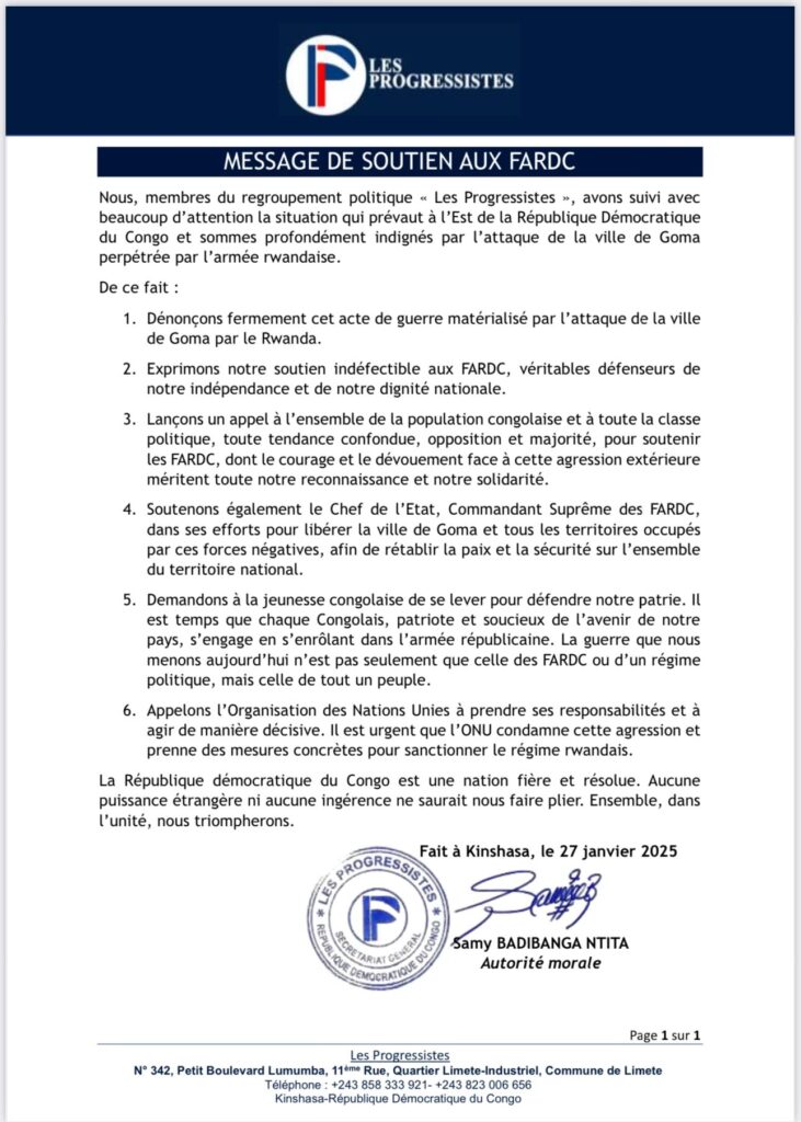 ls ont également appelé l’ensemble de la population et la classe politique, Majorité et Opposition, à être solidaires avec l’Armée nationale et accompagner le Chef de l’État Tshisekedi dans ses efforts pour libérer la ville de Goma et tous les territoires occupés. Ils ont par ailleurs invité l’Organisation des Nations unies à prendre ses responsabilités et à agir de manière décisive. «Il est urgent que l’ONU condamne cette agression et prenne des mesures concrètes pour sanctionner le régime rwandais», ont-ils déclaré. Ci-dessous, le message de soutien du regroupement politique Les Progressistes au Chef de l’Etat et aux FARDC.