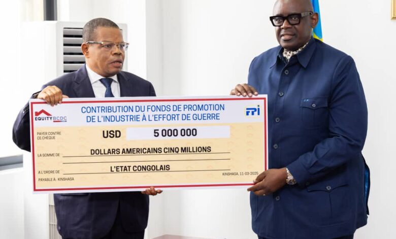 Le Fonds de promotion de l’industrie -FPI- répond favorablement à la mobilisation tous azimuts pour soutenir le gouvernement et les vaillantes forces armées de la RD-Congo qui combattent dans les différents fronts contre les rebelles de l’AFC/M23 soutenus par le Rwanda à l’Est du pays. Dans ce registre, mardi 11 mars à Kinshasa, le FPI par le truchement de son Directeur général Bertin Mudimu, a officiellement remis un chèque d’USD 5 millions au ministre de l’Industrie, petites et moyennes entreprises, Louis Watum Kabamba.