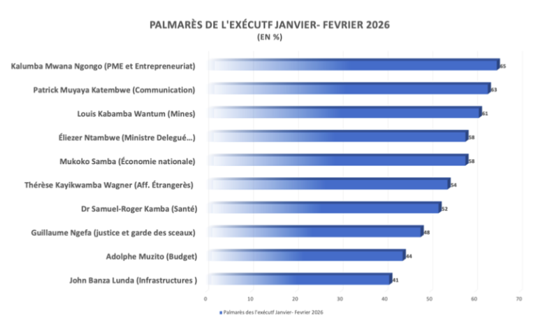 Au sein de l’équipe gouvernementale, Justin Kalumba Mwana Ngongo, ministre de l’Entrepreneuriat et des PME, apparaît comme la figure la plus dynamique de ce début d’année. Crédité de 65% d’opinions favorables, il occupe la première place du classement ministériel du baromètre Les Points-Gouvernement. Une popularité qui s’explique par une présence soutenue sur le terrain et par le lancement imminent d’un projet à forte portée économique: le programme présidentiel «Debout Jeunes congolais».