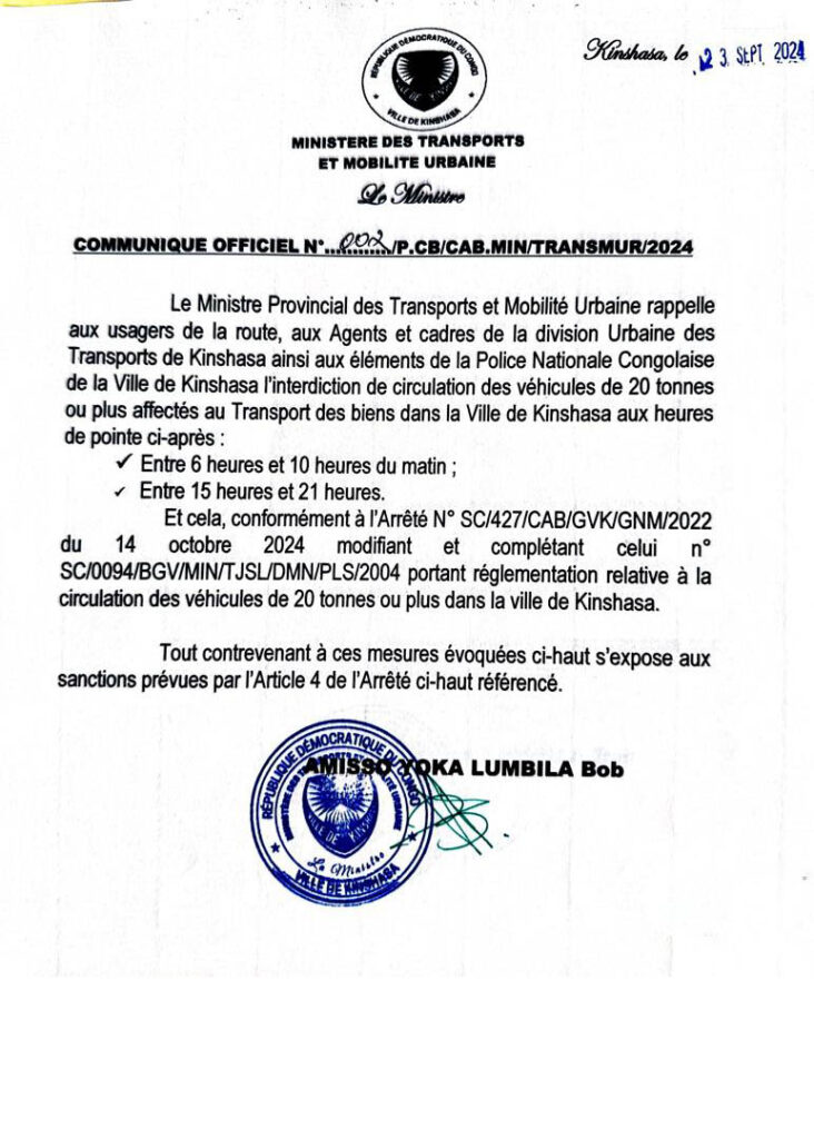 Bob Amiso, ministre provincial de Kinshasa en charge des Transports et mobilité urbaine, a interdit la circulation des véhicules poids lourds sur la voie publique pendant les heures de pointe. Précisément, entre 6h et 10h du matin ainsi que entre 15h et 21h.
