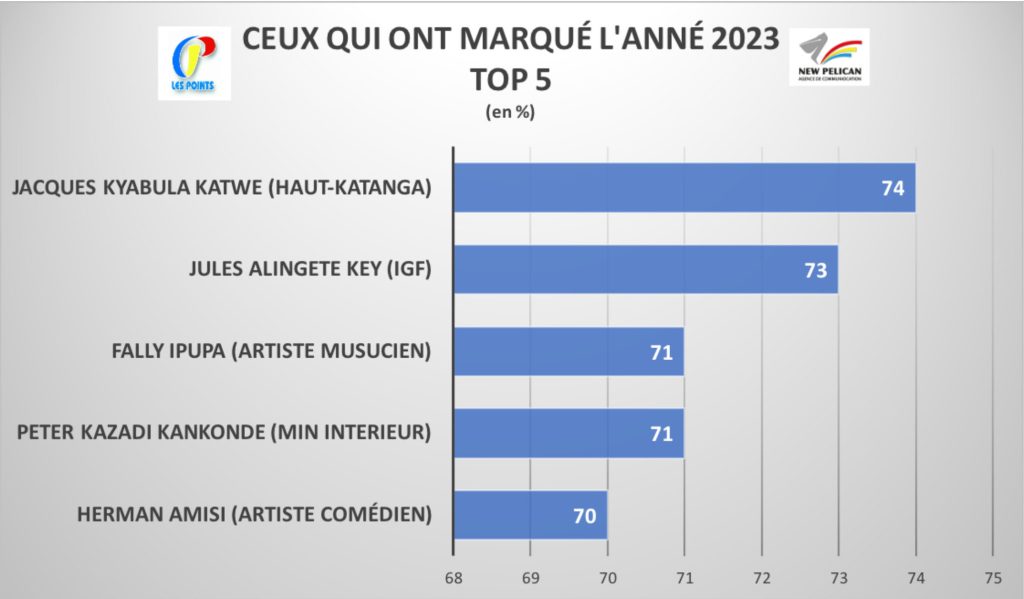 Dans ce top 5, s’invitent deux artistes, auteurs de hauts faits d’armes en 2023. D’un côté, le chanteur Fally Ipupa, qui s’en sort avec 71% des opinions favorables, et de l’autre, l’humoriste Herman Amisi, accrédité de 70%. Le gouverneur du Haut-Katanga, Jacques Kyabula Katwe, coiffe ce quinté avec 74%, talonnés par Jules Alingete Key et ses 73%. Le vice-Premier ministre en charge de l’Intérieur, Peter Kazadi, arrive en troisième position, en ex-aequo avec Fally Ipupa, pour avoir glané 71%.