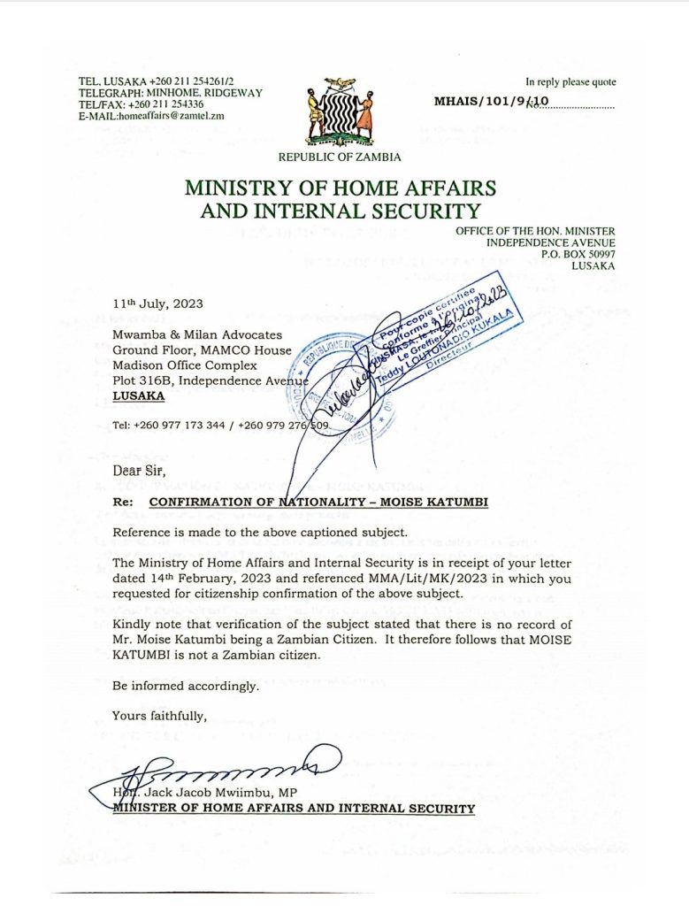 « Veuillez noter qu’après vérification et analyse de l’objet en question, il n’y a aucune trace que M. Moise Katumbi soit un citoyen zambien. Il s’en suit que Moise Katumbi n’est pas un citoyen zambien », a répondu de manière tranchée le ministre de l’Intérieur et de la sécurité intérieure, Jack Jacob Mwiimbu, dans une note du 11 juillet 2023 qu’AfricaNews a pu consulter.